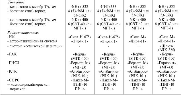 АПЛ пр. 675МКявлялась третьей модификацией пр. 675. На этом корабле ПКРК П-6 заменили ПКРК «Базальт» с ПКР-500. Эта ракета (как и П-6) оснащалась маршевым ТРД, но имела стартовый агрегат (а не стартовый двигатель). Она могла развивать скорость до М = 2,5 и обладала максимальной дальностью полета 500 км. Благодаря наличию бортовых ЭВМ ракеты залпа могли распределять цели между собой (такая система была создана впервые в мире), а также выбирать главную цель в ордере самостоятельно. Кроме того, каждая ракета оснащалась системой РТЗ, обесл печивающей отвод от нее зенитных ракет. Для преодоления ближнего рубежа ПРО ПКР имели частичное бронирование. На ПЛАРК пр. 675МК установили систему целеуказания «Касатка-Б», увеличили длину контейнеров и их внутренний диаметр (за счет выноса шпангоутов на наружную поверхность), заменили систему управления и наведения на цель «Аргумент» на систему «Аргон-К», которая совместно с системой предстартовой подготовки КР обеспечивала залповую стрельбу всеми восемью ракетами сразу.